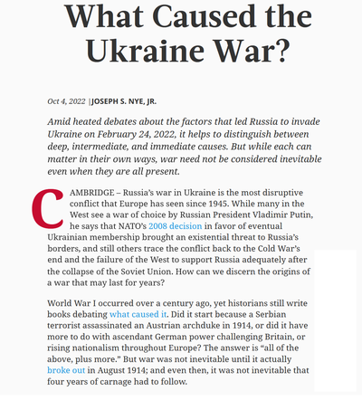 Nyes These ist im Ergebnis, dass der Krieg in der Ukraine trotz allem nicht unvermeidlich war, mit der Zeit aber immer wahrscheinlicher wurde. Leider macht er keine weiteren Aussagen darüber, warum der Krieg trotz seiner Vermeidbarkeit ausgebrochen ist. Ebenso fehlen tiefergehende Überlegungen zu möglichen Alternativen für den am 24. Februar 2022 entzündeten Flächenbrand in der Ukraine. Sein Text fordert jedoch dazu heraus, eine differenziertere Kausalanalyse vorzunehmen.