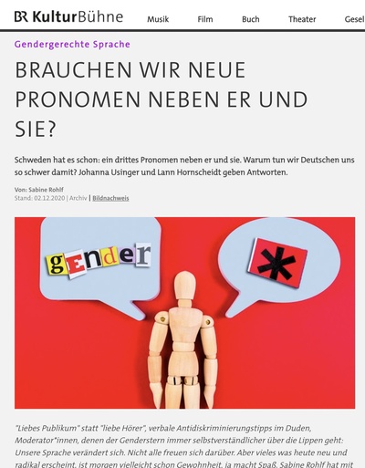 Lann Hornscheidt bezeichnet sich selbst als genderfreie Person und setzt sich für den Gebrauch einer neutralen Form namens „ens“ ein, die als Suffix auch die Endungen -er und -in bei Berufs- oder Tätigkeitsbezeichnungen ersetzen soll. Johanna Usinger wiederum baut auf ihrer Webseite geschicktgendern.de ein Nachschlagewerk auf, das Menschen bei gendergerechtem Schreiben helfen soll. Im Interview mit dem Bayerischen Rundfunk erzählen beide, wie andere Menschen auf ihre Arbeit reagieren.