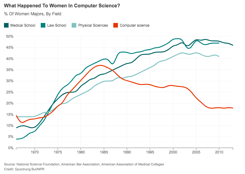 Frauen waren in den Jahrzehnten des Beginns der Digitalisierung vielfach als Ingenieurinnen an der Entwicklung beteiligt. Heute sind Frauen in der Branche vor allem in kreativen oder vermeintlich „traditionell weiblichen“ Bereichen tätig – Marketing, Personal, Organisation oder Redaktion. Technisches Know How aus Schule und Universität bringen Frauen seltener in den Beruf mit. Auch die Zahl der Studentinnen in MINT-Studiengängen ist weiterhin sinkend.