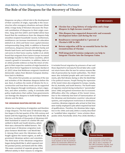 Am 20. Juni 2023 hat die Europäische Kommission ein eigenes Finanzierungsinstrument vorgeschlagen, um den Wiederaufbau und die Modernisierung der kriegszerstörten Ukraine mit rund 50 Milliarden Euro für die Jahre 2024-2027 zu unterstützen. Auch andere Staaten, allen voran die USA, haben einen Tag später auf der Geberkonferenz für die Ukraine in London mehrere Milliarden Dollar für den Wiederaufbau zugesagt. Laut den Ökonom:innen Joop Adema, Yvonne Giesing, Tetyana Panchenko und Panu Poutvaara vom ifo-Institut für Wirtschaftsforschung habe neben der staatlichen Auslandshilfe auch die global vernetzte ukrainische Diaspora das Potenzial, einen wesentlichen Beitrag zum Wiederaufbau zu leisten.