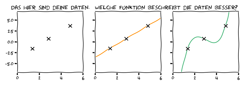 Im modernen maschinellen Lernen sind nicht nur die Daten relevant, sondern auch das Modell, das wir dem Lernen zugrunde legen. Diese Modelle treffen implizit immer Annahmen über unsere Daten – eine lineare Funktion kann zum Beispiel nur eine Gerade beschreiben. Sobald wir uns für ein festes Modell entscheiden und somit implizit Annahmen treffen, können wir beweisen, ob eine Lernalgorithmus besser ist als ein anderer. Sobald wir uns in unserem Beispiel oben auf lineare Funktionen beschränken, gibt es Geraden, die unsere Daten besser beschreiben als andere. Die Tatsache, dass wir irgendeine Form von Annahmen brauchen, bleibt jedoch bestehen: „Welche Annahmen beschreiben unsere Daten besser?“ wird zu „Welches Modell beschreibt implizit die Struktur unserer Daten besser?“.