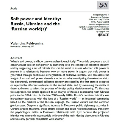 Die Politikwissenschaftlerin Valentina Feklyunina schlägt eine sozialkonstruktivistische Sichtweise von Soft Power vor. Diese stützt sich auf die Annahme, dass Soft Power die größten Erfolgschancen zwischen Akteuren mit sich bringt, die kompatible Identitäten haben. In anderen Worten: „Wir mögen diejenigen, die uns ähnlich sind.“