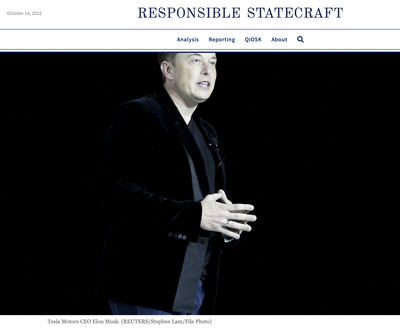 „Musk scheint zu begreifen, was die Regierung Biden nicht begreift“, schreibt er, nämlich, dass Putin nicht der roten Linie Washingtons folgt, also eine Konfrontation mit den USA und der Nato um jeden Preis vermeiden zu wollen. Washington setze irrtümlich darauf, dass Putin erkennt, dass die Kosten der Aggression die potenziellen Vorteile bei weitem überwiegen. Diese Rechnung ging bis jetzt jedoch nicht auf: Statt zu deeskalieren, hat Putin den Krieg bis jetzt immer weiter eskaliert.