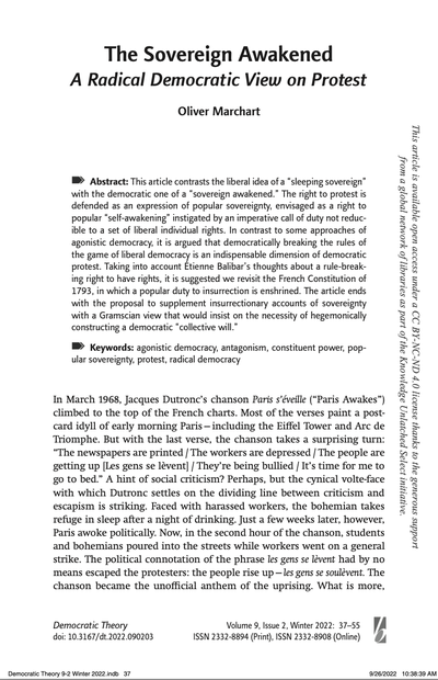 Dem Bild des Volkes als ein „schlafendes Souverän“ setzt er die Vorstellung einer Demokratie entgegen, in der das Volk im Protest stets aufs Neue aufsteht und seine Souveränität einfordert.