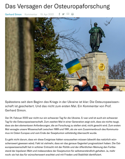 Der 24. Februar 2022 sei ein schwarzer Tag für die Osteuropawissenschaft, denn „zum zweiten Mal in einer Generation zeigt sich, dass sie nichts taugt“, so der Slawist Gerhard Simon. In seinem Artikel, der knapp einen Monat nach dem russischen Überfall auf die Ukraine erschienen ist, übt Simon scharfe Kritik an der Osteuropawissenschaft.
