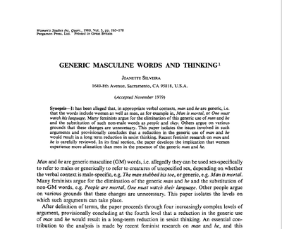 Silveira kommt zu dem Schluss, dass generische Maskulina eine klare Wahrnehmungsverzerrung in die männliche Richtung verursachen. Zugleich machen sie die Benachteiligung von nicht-männlichen Personen sichtbar. Foxx Silveira arbeitete sich in der Begründung von den einfachen Effekten an der sprachlichen Oberfläche über deren kausale Wechselwirkung mit dem gesellschaftlichen Kontext bis hin zu den Auswirkungen auf die Wahrnehmung von Frauen vor. Fast nebenbei legt sie zudem den unhinterfragten linguistischen Sexismus der damaligen etablierten Sprachwissenschaft offen und verdeutlicht, wie die implizite Annahme Mensch = männlich die Tragweite ihrer Beobachtungen schmälert.