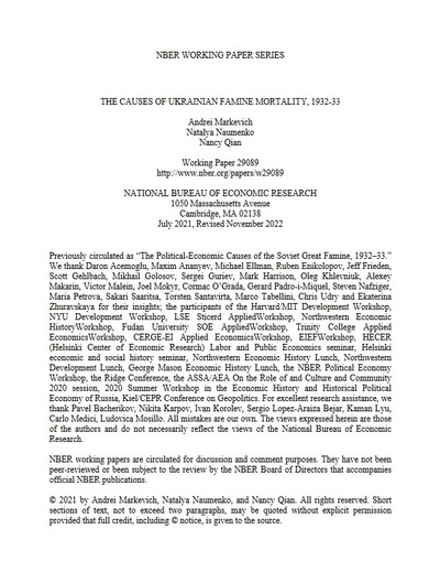 Andrei Markevich, Natalya Naumenko und Nacy Qian drängen mit ihrer Arbeit auf eine Neubewertung der Genozidfrage des Holodomors: In ihrer 2022 erschienenen Studie The Causes of Ukrainian Famine Mortality werten sie historische Daten und Dokumente aus der Sowjetunion aus, um Erklärungen für die drastische Sterblichkeitsrate der Ukrainer:innen im Holodomor zu finden.