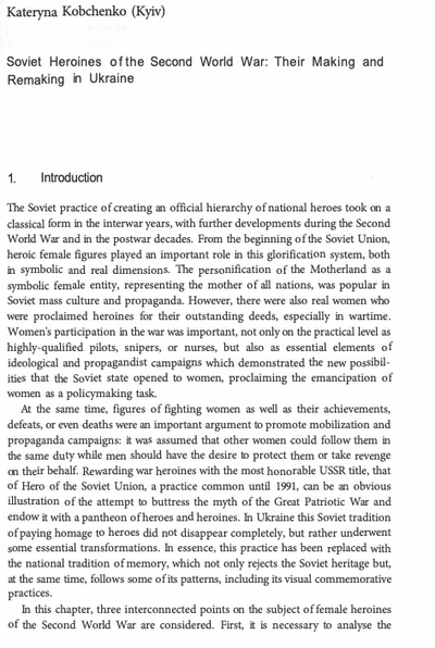 Die Heldinnen und Helden der Sowjetunion waren diejenigen, die starben, als sie ihre Pflichten gegenüber dem Staat oder Stalin erfüllten. Dies sei die höchste Form von Heroismus gewesen, so Kobchenko. Insgesamt wurden in der Sowjetunion 95 Frauen als Held der Sowjetunion ausgezeichnet. Die meisten von ihnen hatten im Zweiten Weltkrieg etwas Bestimmtes geleistet oder ihr Leben geopfert. Eine der bekanntesten sowjetischen Frauen, die zur Heldin wurde, war Soja Kosmodemjanskaja, eine Partisanin, die 1941 im Alter von 18 Jahren von deutschen Besatzern gefoltert und hingerichtet wurde. Kobchenko schreibt, dass Kosmodemjanskaja als „Märtyrerin im Namen Stalins“ in das sowjetische Kollektivgedächtnis einging. Neben den Geschichten der Märtyrer, die sich für Mutter Heimat und Stalin opferten, waren die Biographien von Pilotinnen ein populärer Heldenmythos, denn das Fliegen, so Kobchenko, war das Symbol für Moderne und Fortschritt schlechthin. Kobchenko schreibt, dass der sowjetische Kult um tote Helden und Heldinnen sowie ihre Verehrung sie unsterblich gemacht habe. Durch Denkmäler und Erinnerungsrituale würden die Helden und Heldinnen ein dauerhaftes Dasein auf der irdischen Welt erhalten.