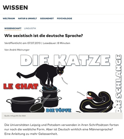 In seinem Artikel in der „Welt“ möchte André Meinunger der seiner Ansicht nach falschen Behauptung, die Deutsche Sprache werde von männlichen Formen dominiert, etwas entgegensetzen.