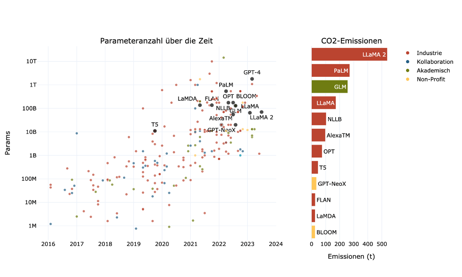Neben der ökonomischen Nachhaltigkeit gibt es aber noch weitere Nachhaltigkeitsaspekte, die gegen die Entwicklung immer größerer Modelle sprechen. In einem Forschungspapier von 2019 zeigen Strubell und Kolleg:innen, dass das Training eines großen Sprachmodells denselben CO2-Fußabdruck haben kann wie fünf Autos in ihrer gesamten Lebenszeit. Und auch aus demokratischer Perspektive sind die stetig wachsenden Modelle nicht nachhaltig. Schon seit einigen Jahren wird die ML-Forschung von