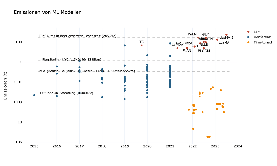 Wenn wir uns die vorigen Abbildungen anschauen, wird schnell klar: In Bezug auf ökologische Nachhaltigkeit haben wir in erster Linie kein KI-, sondern ein Big-Tech-Problem. Es sind die großen Modelle, die hohe Emissionen freisetzen und deren Trainingsdaten und Programmcode hinter verschlossenen Türen bleiben, während kleinere Projekte ihren Code meist veröffentlichen und häufig nicht mehr Emissionen freisetzen, als wenn man Arielle, die Meerjungfrau streamen würde.