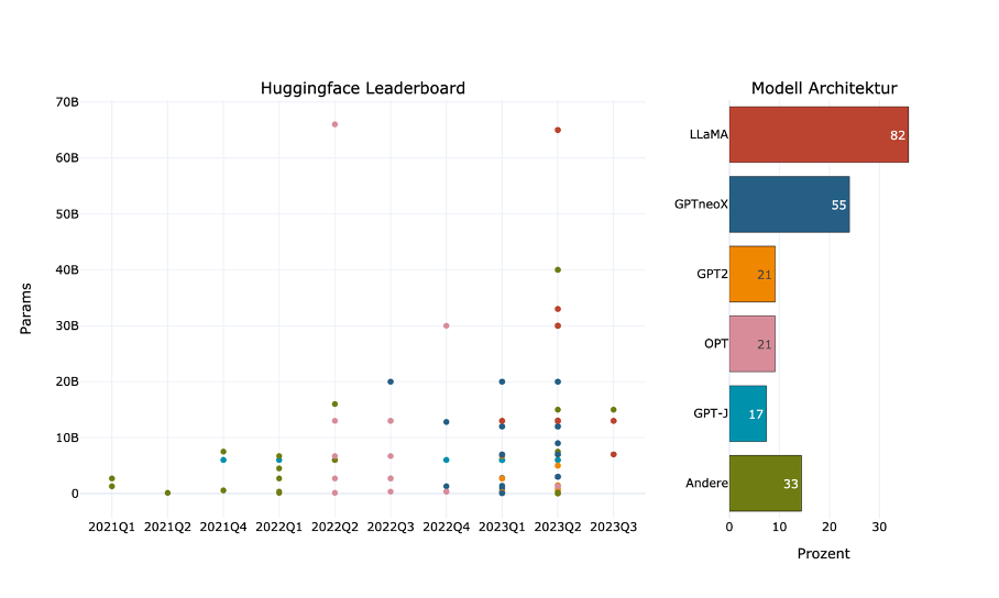Ende Februar dieses Jahres verkündete Meta, dass sie das Sprachmodell LLaMA für die Forschung veröffentlichen. Entsprechenden Einrichtungen wurde die Möglichkeit gegeben, sich für den exklusiven Zugang zu bewerben. Nur eine Woche später wurde das Modell allerdings geleaked und war von dann an offen im Netz verfügbar. Man könnte nun meinen, dass dies negative Folgen für Meta gehabt hätte, aber tatsächlich wurde dieser Vorfall selbst von der Konkurrenz als Glücksfall gewertet. In einem geleakten Memo eines Softwareentwicklers von Google heißt es, dass Meta nun kostenfreie Mitarbeit erhalte. Dies begründete er damit, dass künftige Innovationen durch den Leak vermutlich auf der LLaMA-Architektur basieren würden. Und tatsächlich hat sich diese Prognose bewahrheitet. Schaut man auf das Open LLM Leaderboard von Hugging Face, das LLMs der Open-Source-Community listet, bauen die meisten Ansätze auf LLaMA auf (Abbildung 3). Auch Meta scheint diese Entwicklung zu begrüßen. Kürzlich wurde LLaMA 2 veröffentlicht. Diesmal ist es allerdings direkt für alle offen zugänglich und sogar mit einer Lizenz zur kommerziellen Verwendung versehen, was bei bisherigen LLMs selten ist.