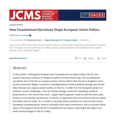 Im Zuge des russischen Angriffs auf die Ukraine müsse man einen kritischeren Blick auf die Gründungsnarrative der EU werfen, so Catherine De Vries. Denn der Krieg stelle diese infrage: Nicht nur sei die Hoffnung auf ein friedliches Nachkriegseuropa erschüttert worden. Auch die Vorstellung, die europäisch-russischen Wirtschaftsverflechtungen und ein Netz diplomatischer Abkommen würden militärische Wege der Konfliktaustragung verunmöglichen, habe sich nicht bewahrheitet. Schließlich sei zudem unklar, ob die Krise in der Ukraine auch zu neuen Fortschritten bei der europäischen Integration beitrage oder nicht gar