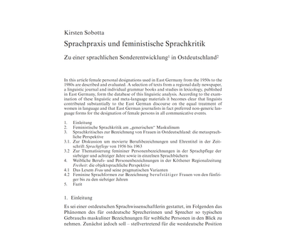 Darauf deuten auch Sobottas Befunde aus der Zeitschrift Freiheit hin, wo sich in den 1950er, 60er und 70er Jahren zahlreiche Ingenieurinnen, Nationalpreisträgerinnen, Betriebsleiterinnen und Genossinnen finden lassen, mehr oder wenig bunt durchmischt mit den entsprechenden generisch-maskulinen Formen wie Korrespondent, Leiter oder Oberrichter (ebenfalls für weibliche Personen verwendet). Die Autorin bemerkt einschränkend: „Allerdings konnte eine Dominanz nicht-generischer Sprachformen nur in jenen Zeitungstexten festgestellt werden, die über den Demokratischen Frauenbund Deutschlands (DFD) bzw. über Aktivitäten seiner Mitglieder berichteten.“