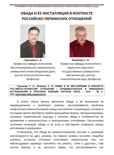 Die ukrainischen Psychologieprofessoren Serhey Harkavets und Sergey Yakovenko analysierten 2014 den sich zuspitzenden Konflikt zwischen Moskau und Kiew als ein psycho-emotionales Phänomen, das aus dem Gefühl einer tiefen Kränkung