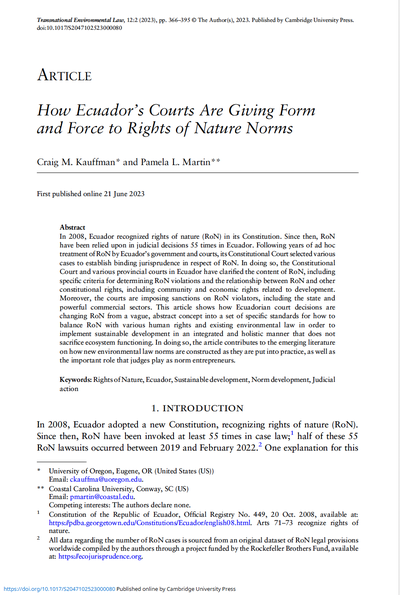 Die Rechte der Natur werden vielfach als eine abstrakte Utopie dargestellt. Kauffmans und Martins Studie zeigt jedoch, dass Ecuador wesentliche Schritte zu ihrer Realisierung getätigt hat. Die Zukunft wird zeigen, wie sehr sich dieser Erfolg auch auf andere Länder ausweiten kann. Im Allgemeinen wird es spannend sein, zu sehen, wie lange die Diskrepanz zwischen einer Judikative, die sich, wie im Falle Ecuadors, kontinuierlich gegen die Interessen der Exekutive stellt, funktionieren kann. Weitere Fragen betreffen das Spannungsverhältnis zwischen wirtschaftlichem Wohlstand und Naturschutz sowie der Kompatibilität zwischen verschiedenen Formen der Natur, wie beispielsweise dem Unterschied zwischen individuellen Tieren und kollektiven Arten. Konflikte gibt es nichtsdestotrotz seit jeher, auch innerhalb der Menschenrechte. In der derzeitigen Verfassung der planetaren Gesundheit mag eine etablierte Vertretung der Natur trotz aller Bedenken vorsichtigen Anlass zur Hoffnung geben.