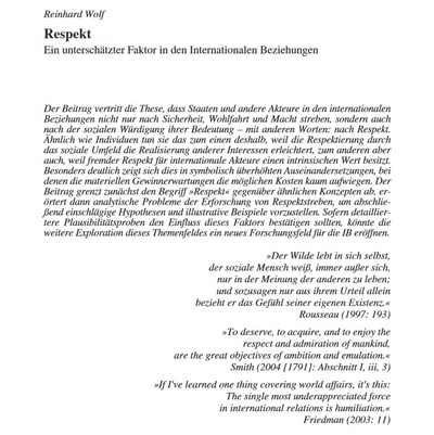 Mit Respekt als einem wichtigen und unterschätzten Faktor beschäftigt sich in seinem Artikel der Professor für Internationale Beziehungen, Reinhard Wolf. Sein Beitrag ist im sogenannten „