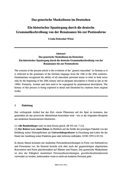 Ein vergleichbares „patriarchales normatives Ergreifen“ gab es bei uns nicht, stellt Ursula Doleschal in ihrer Rückschau der deutschen Grammatikschreibung vom 16. bis ins 21. Jahrhundert fest. Allerdings war das generische Maskulinum wohl auch nicht seit jeher so in Gebrauch, wie wir es heute kennen.