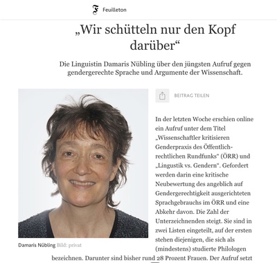 Gleich zu Beginn des Interviews spricht Nübling den meisten Unterzeichnern des Aufrufs die fachliche Kompetenz für germanistische Linguistik ab. Die Verfasser repräsentierten zudem nicht die in der Forschung aktiven Linguisten.