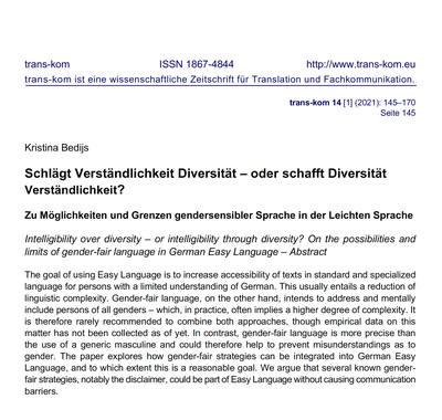 Sie untersucht daher die gängigsten Strategien zum Gendern auf ihre Umsetzbarkeit in Leichter Sprache. Viele fallen aus verschiedenen Gründen raus: Paarformen („Lehrerinnen und Lehrer“) sind etwa zu lang und bleiben binär. Neutralisierungen („Lehrkraft“ statt „Lehrer“, „Publikum“ statt „Zuschauer“) funktionieren dagegen gut, aber nur wenn sie gängig genug sind. Bei Suffixformen wie dem Sternchen („Lehrer*innen“) wird häufig angeführt, Sonderzeichen seien ein Problem sowohl beim Lesen als auch beim Vorlesen durch Screenreader. Bedijs zieht hier eine Parallele zum €-Zeichen: Auch dieses ist mit seinen 20 Jahren verhältnismäßig „neu“ und dennoch fester Teil der Sprachrealität von Nutzer*innen der Leichten Sprache. Vorlesegeräte können es mittlerweile problemlos aussprechen und eine technische Anpassung an einen typographischen Gender-Marker sei genauso möglich. Ein Zeichen kann per Disclaimer am Textanfang eingeführt werden, zum Beispiel mit dem Mediopunkt, der in der Leichten Sprache als Lesehilfe längere Wörter in kleine Einheiten unterteilt („Lehrer·zimmer·tür“).
