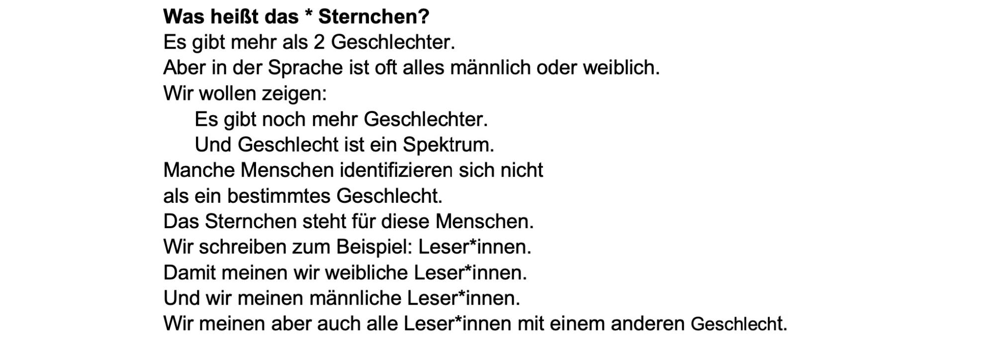 Hinter dem Gendern steht eine Sprachkritik. Sie will darauf aufmerksam machen, dass etablierte Normen wie das generische Maskulinum Frauen und nicht-binäre Menschen unsichtbar machen. Aber es gibt noch weitere Gruppen, denen unsere Schreib- und Sprechgewohnheiten Probleme bereiten: Analphabet*innen, Seh- und Hörbehinderten, Menschen mit Lernschwierigkeiten und Immigrant*innen mit eingeschränkten Deutschkenntnissen bleibt eine kommunikative Teilhabe am Alltag verwehrt, da standardsprachliche Texte für sie nicht verständlich sind. Für diese Gruppen gibt es sprachliche Ansätze, die über die Verminderung von Komplexität einen Zugang bieten sollen. Besonders verbreitet ist die Leichte Sprache, deren Regelwerk in Deutschland seit 2006 vom Netzwerk Leichte Sprache betreut wird.