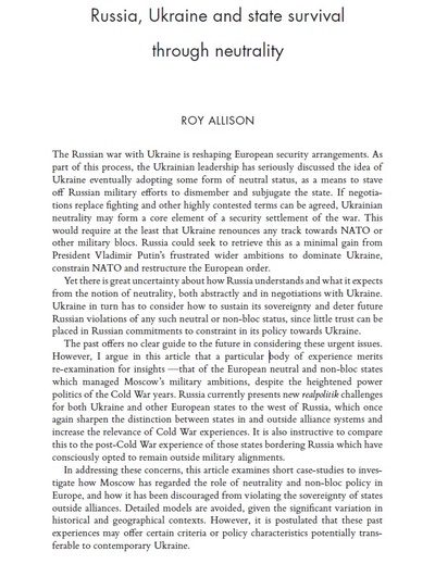 Der britische Politikwissenschaftler Roy Allison von der Universität Oxford argumentiert hingegen, dass die Neutralitätsoption für die Ukraine in der Anfangsphase des Krieges wenig vielversprechend war. Denn Putins Rhetorik ließ erkennen, dass er die Ukraine nicht in eine Form der Neutralität, sondern zurück in die russische Einflusssphäre oder gar in eine Position der Unterwerfung zwingen wollte.
