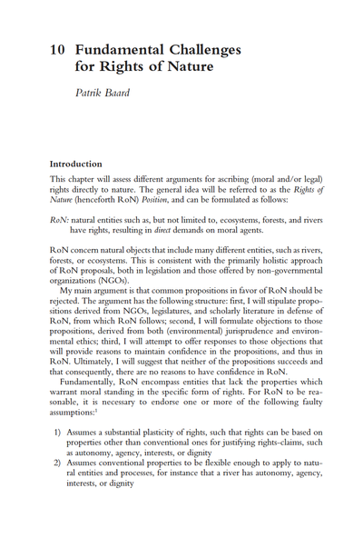 Zu den bekanntesten dieser Charakteristika zählen Autonomie, Handlungsfähigkeit, Interessen, Schmerzempfinden und Würde. Diverse Autor*innen plädieren teilweise seit Jahrhunderten dafür, dass diese auch nichtmenschliche Tiere innehaben und sie deshalb Rechte bekommen sollten. Bei den Rechten der Natur wird es schwierig. Kann ein Fluss ein Interesse haben? Oder Würde? Vielleicht gar einen vom Menschen unabhängigen intrinsischen Wert? Wenn dem so wäre, müsste man zusätzlich den Sprung von diesen Charakteristika auf Rechte argumentieren. Auch dieser ist nicht von alleine gegeben. Selbst wenn es die richtigen Bedingungen für einen Sprung gebe, so Baard weiter, dann würden die Rechte für die gesamte Natur die Idee der Rechte selbst trivialisieren. Wenn alles Rechte hat, dann hat nichts Rechte.