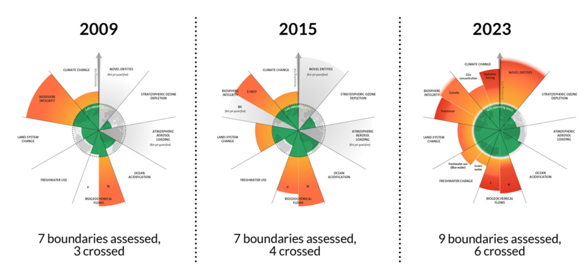 In der hier besprochenen Studie aus dem Jahr 2023 konnten erstmals alle neun Belastungsgrenzen quantifiziert und somit Aufschluss über deren eigentlichen Zustand gegeben werden. Waren es in der Studie von 2009 noch drei Belastungsgrenzen, befanden sich in einer Studie von 2015 bereits vier in einem alarmierenden Zustand. Die aktuelle Studie von 2023 zeigt, dass von allen neun quantifizierten Belastungsgrenzen sechs bereits überschritten sind: Dies betrifft den Klimawandel, die Überladung mit neuartigen Stoffen, die Veränderung der biogeochemischen Kreisläufe (Stickstoff- und Phosphor-Kreisläufe), die Veränderung von Süßwasser-Systemen, die Veränderung der Landnutzung und den Zustand der Biosphäre.