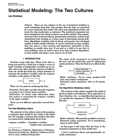 Als Breiman den vorliegenden Essay schreibt, sind die Vorläufer des heutigen maschinellen Lernens noch einfache Modelle aus Statistik und Wahrscheinlichkeitstheorie. Er nennt diese „klassische“ Perspektive Data Modeling Culture.