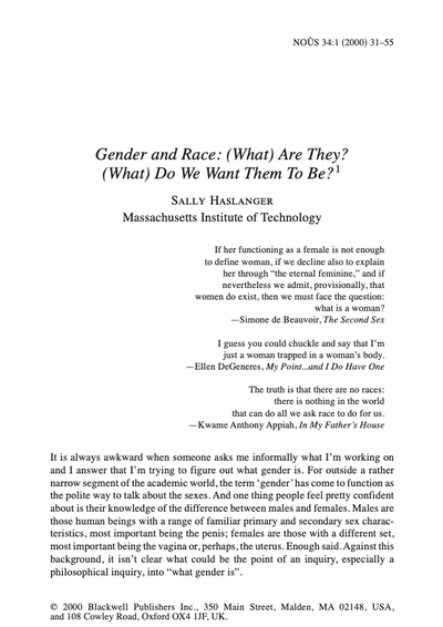 Den Versuch einer Antwort formuliert Sally Haslanger im Jahr 2000, zu einer Zeit, als, wie sie bemerkt, der Begriff aus der akademischen Welt zunehmend in Alltagskonversationen schwappt, ohne dass dabei Einigkeit über dessen Bedeutung bestünde. Für einige ist Gender Ausdruck subjektiver Identität. Für andere meint der Begriff hingegen eine Sammlung von Attributen, die als gesellschaftliche Ideale für „Maskulinität“ beziehungsweise „Feminität“ gelten. Wieder anderen kommt der Begriff als eine höfliche oder mondäne Art gelegen, über Geschlecht zu sprechen – „Gender“ ersetzt dann lediglich den Begriff „Sex“.
