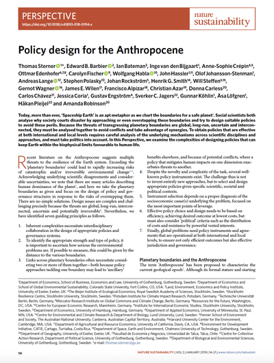 Es entspricht dem interdisziplinären Denkansatz des Stockholm Resilience Center, bei der Erarbeitung von Empfehlungen für solcherlei politische Entscheidungen die Sozialwissenschaft mit ins Boot zu holen. Ein Beispiel hierfür ist die Beteiligung von Rockström und Steffen an einem Paper, das 2019 unter Leitung des schwedischen Umweltökonomen Thomas Sterner publiziert wurde. Der hohe Anspruch an die Reichweite wird bereits im Titel des Aufsatzes deutlich: Policy design for the Anthropocene!