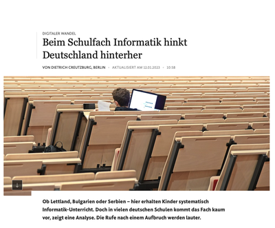 Im Artikel „Beim Schulfach Informatik hinkt Deutschland hinterher” reflektiert Dietrich Creutzburg die Tatsache, dass die Mehrheit der europäischen Länder den Bedarf an Informatik als Pflichtbestandteil des Lehrplans erkannt hat und stellt die Frage, wann Deutschland sich anschließen wird. Schüler*innen wachsen heute in einer digitalen Welt, umgeben von Computern, IT-technischen Systemen und Algorithmen auf. Sie können Apps bedienen und entwickeln ein intuitives Nutzungsverständnis für Smartphones und Tablets. Ein tatsächliches Verständnis davon, wie Computer funktionieren, entwickeln hingegen nur wenige